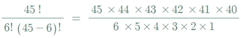 - 로또는 1 ~ 45 숫자 중 6개를 비복원 추출하고 순서는 무시된다.