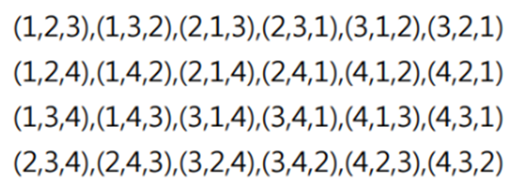 ◈ 예시 : ( 1, 2, 3, 4 ) 에서 3 개를 비복원 추출할 때,
