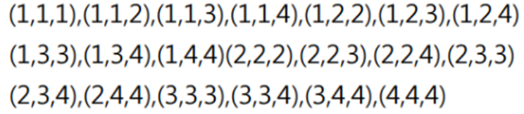 - 중복과 순서를 고려해야 하므로 ( 1,1,1),(1,1,2)...(4,4,4) 형태가 된다.
