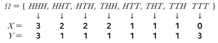 - 앞면의 수를 X 라는 확률변수로, 앞면과 뒷면의 수의 차이는 Y라는 확률변수로 만들 수 있다.