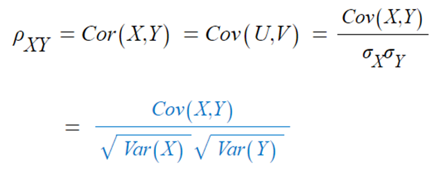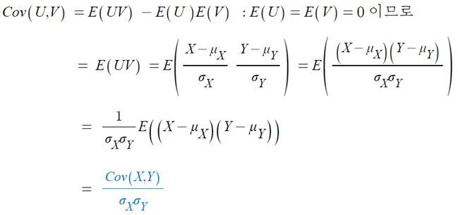 - X와 Y의 상관계수는 표준화된 U,V의 공분산이다.