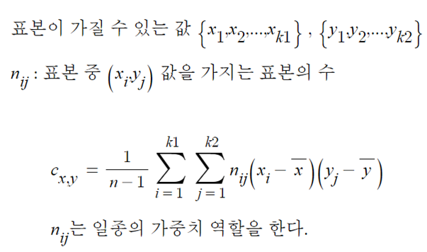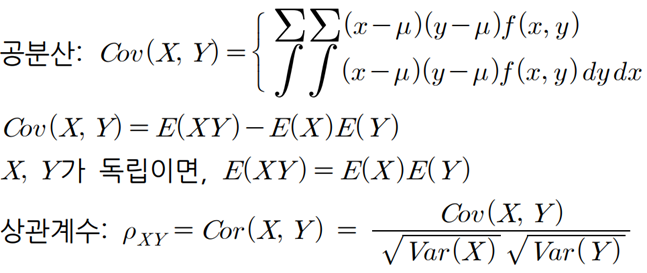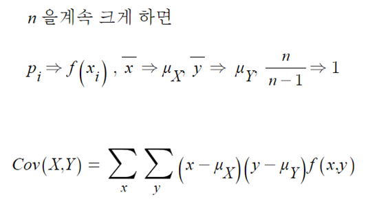 - 확률변수의 공분산은 수치자료 표본공분산으로 부터 유도할 수 있다.