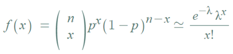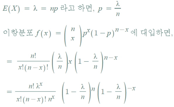 - 이항분포에서 n이 커지면 계산하는데 어려움이 있는데, 포아송분포를 사용하여 이항분포의 근사치를 알 수 있다.