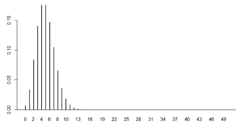 ⇒ p가 매우 작으면 큰 x에 대한 확률은 무시할 정도로 작음. 위 그래프에서 x가 15이상일 때 0에 가까움.