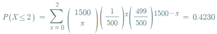 ▶ 이항분포 X ~ B (1500 , 1/500) 에서 X가 2 이하인 경우