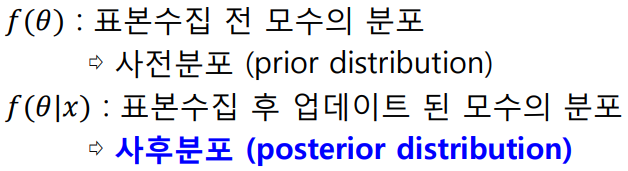 - 베이지안 추론에서 미지의 값은 확률변수 (미지의 값이란 모수, 결측값(missing value), 미래값 )이다.