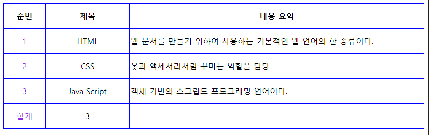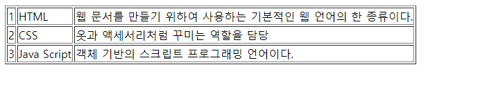 결과물을 보시면, td 내용에 맞추어 폭(width)이 자동 설정이 되기 때문에 자신의 기호에 맞는 Table내의 셀을 만드려면 CSS의 도움이 필요합니다. 이 때 CSS 선택자를 이용하면 훨씬 다양하게 표를 꾸밀 수 있습니다.