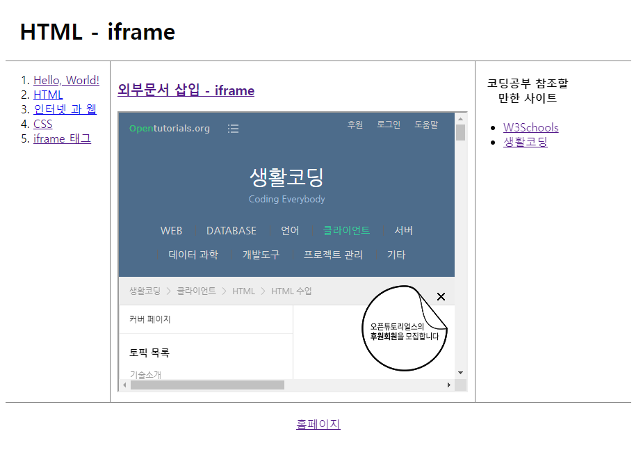 <h3> <a href="https://opentutorials.org/course/2039/10951"> 외부문서 삽입 - iframe </a> </h3>